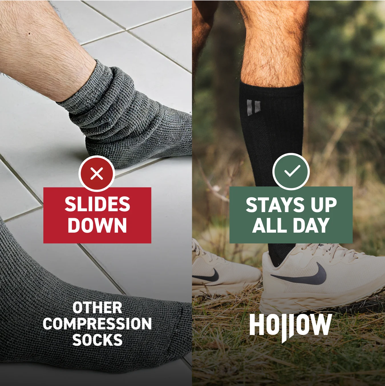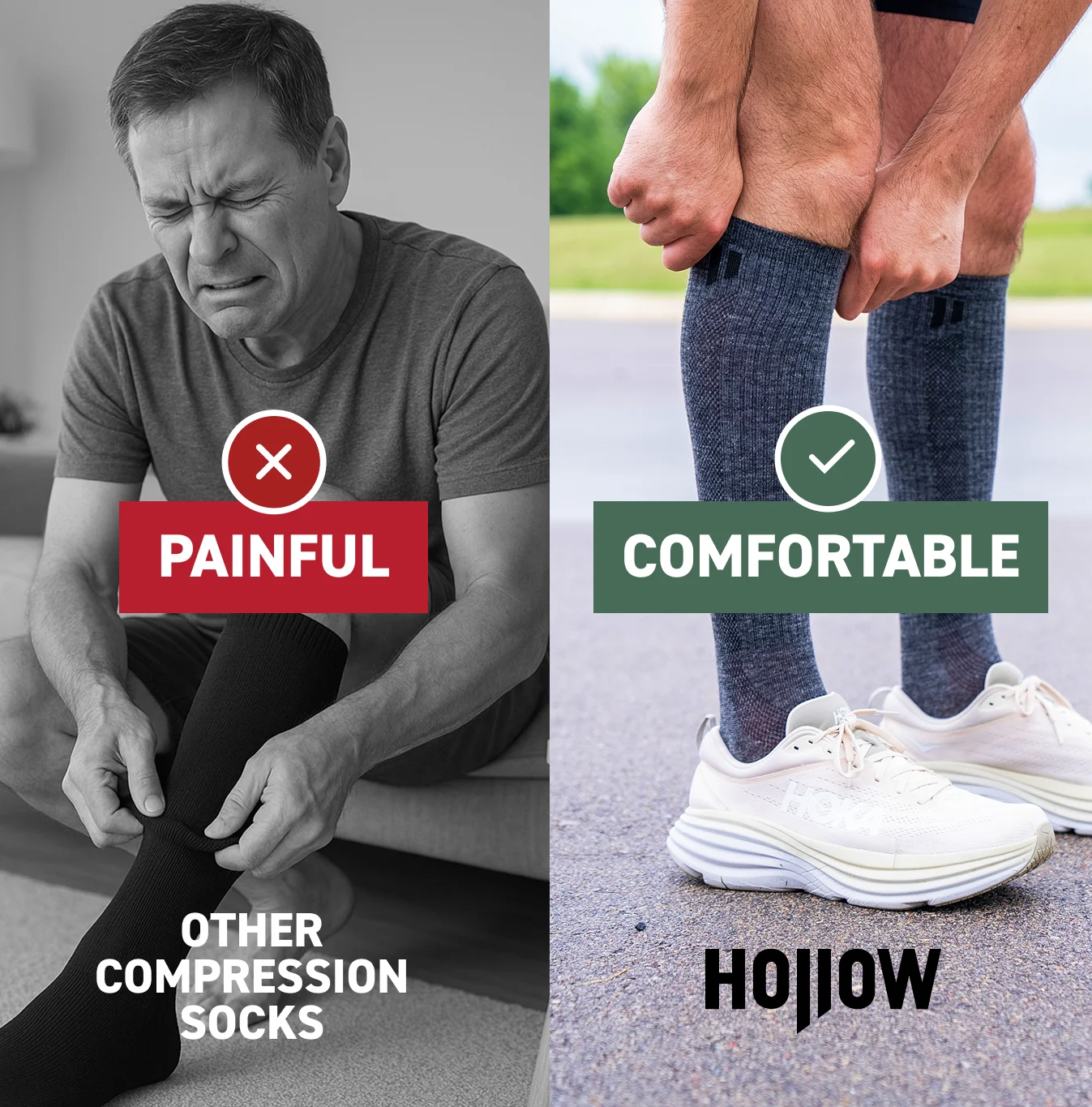Struggling to find compression socks that actually fit? Hollow comes in a full range of men's and women's sizes. Including true wide-calf options. They fit larger legs comfortably without painful squeezing or rolling down