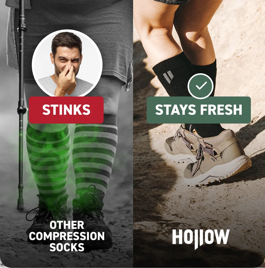 Most compression socks lose their squeeze after a few weeks. Hollow uses alpaca mixed with strong nylon. Keeps working through hundreds of washes.