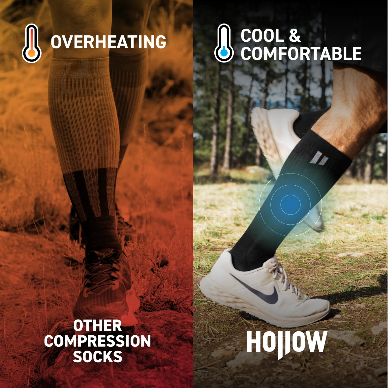 Most compression socks make you pick support OR comfort. Hollow gives you both. Premium alpaca gives you the right squeeze while keeping moisture and heat under control all day.