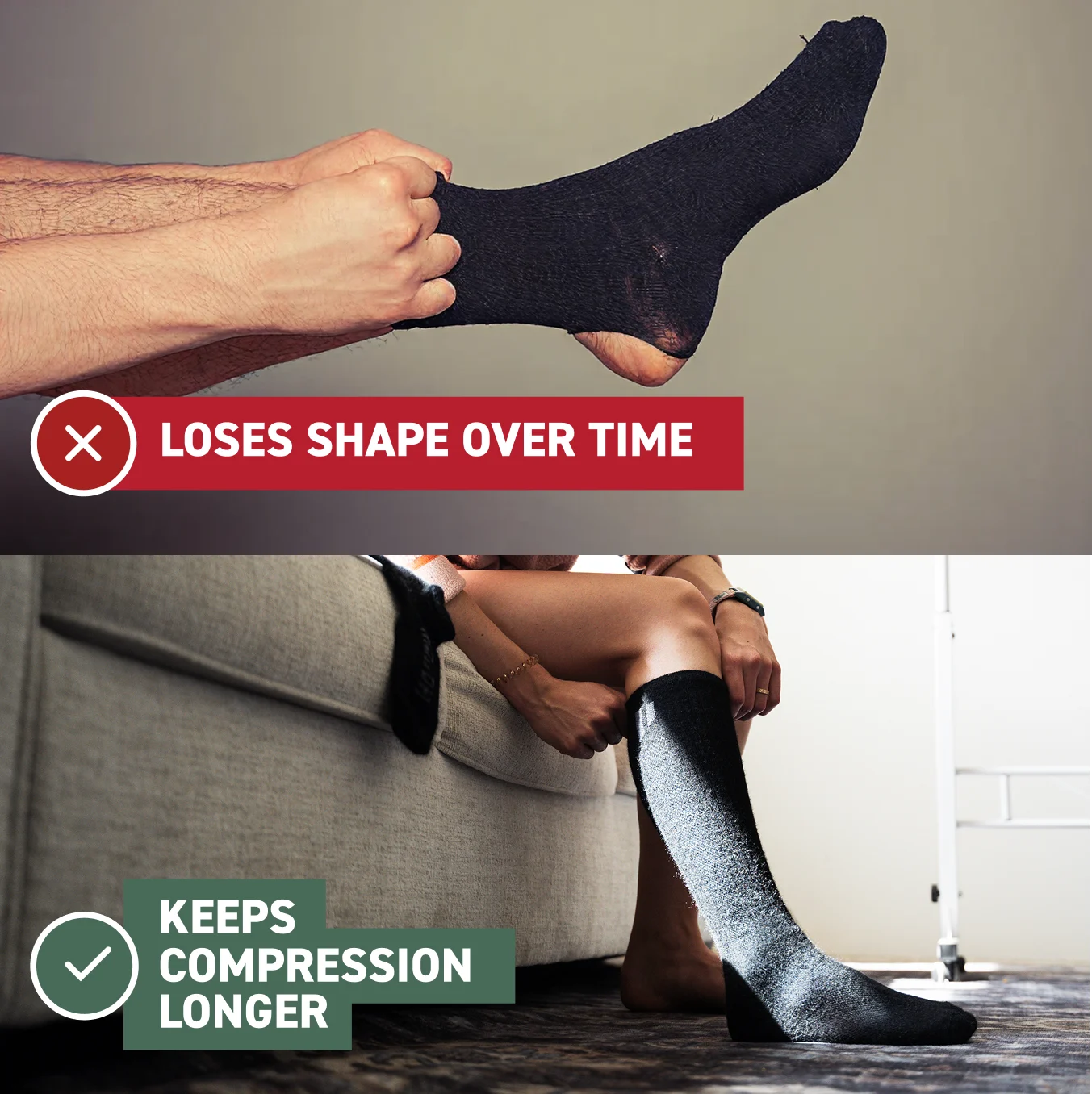 These stay put all day without pinching or sliding down. Special alpaca weave with elastic arch support gives you compression without pressure spots. No more pulling them back up every hour.
