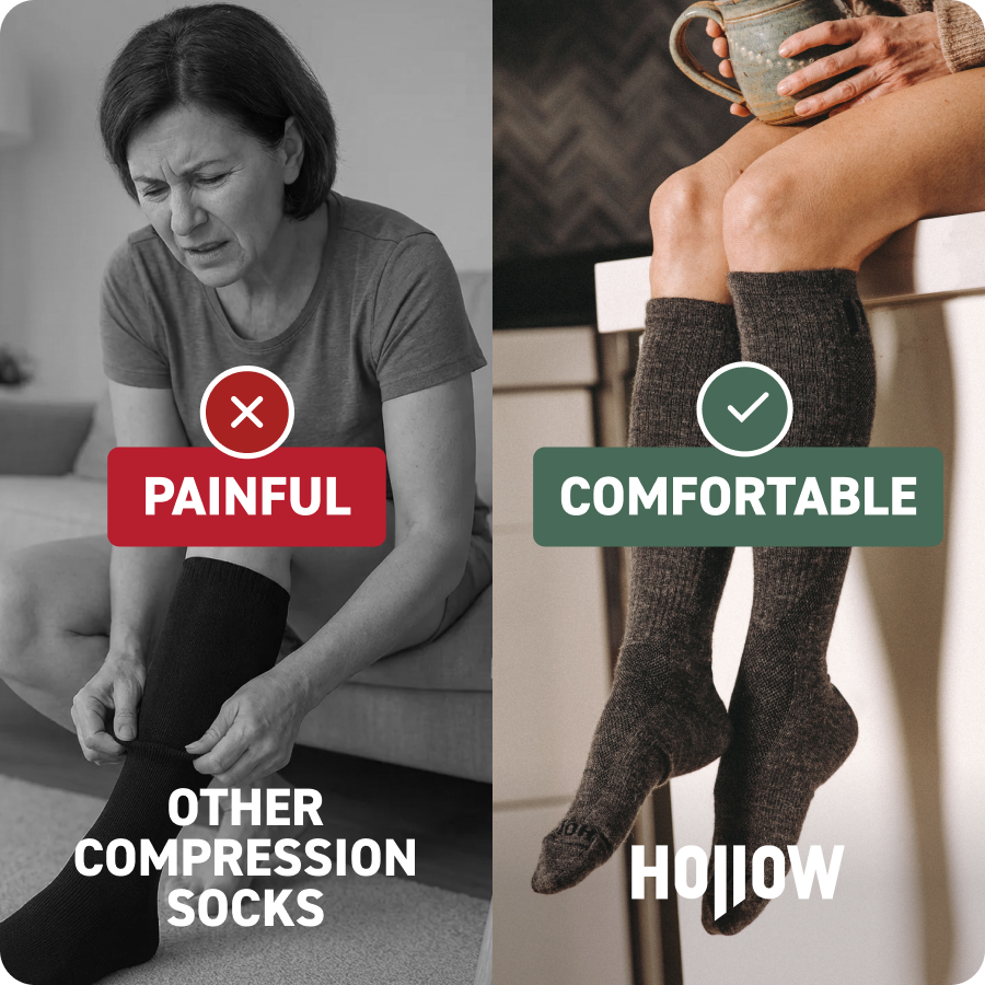 Most compression socks make you pick support OR comfort. Hollow gives you both. Premium alpaca gives you the right squeeze while keeping moisture and heat under control all day.