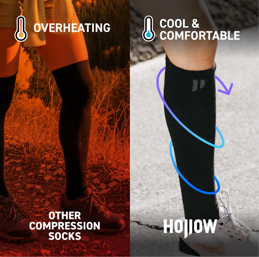Tired of compression socks that squeeze in all the wrong places? Hollow comes in a full range of sizes—including true wide-calf options. No painful pinching. No awkward bulging. Just the right amount of compression from ankle to calf, designed to fit real legs comfortably.
