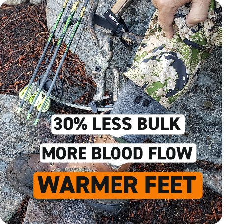 Warm feet need room for proper blood flow. Most hunting socks are so thick they cut circulation and turn your feet into ice blocks. Hollow Hunting Socks have a 30% thinner profile AND slight compression for long sits. Plus the baby alpaca is the softest sock material you’ve ever tried.