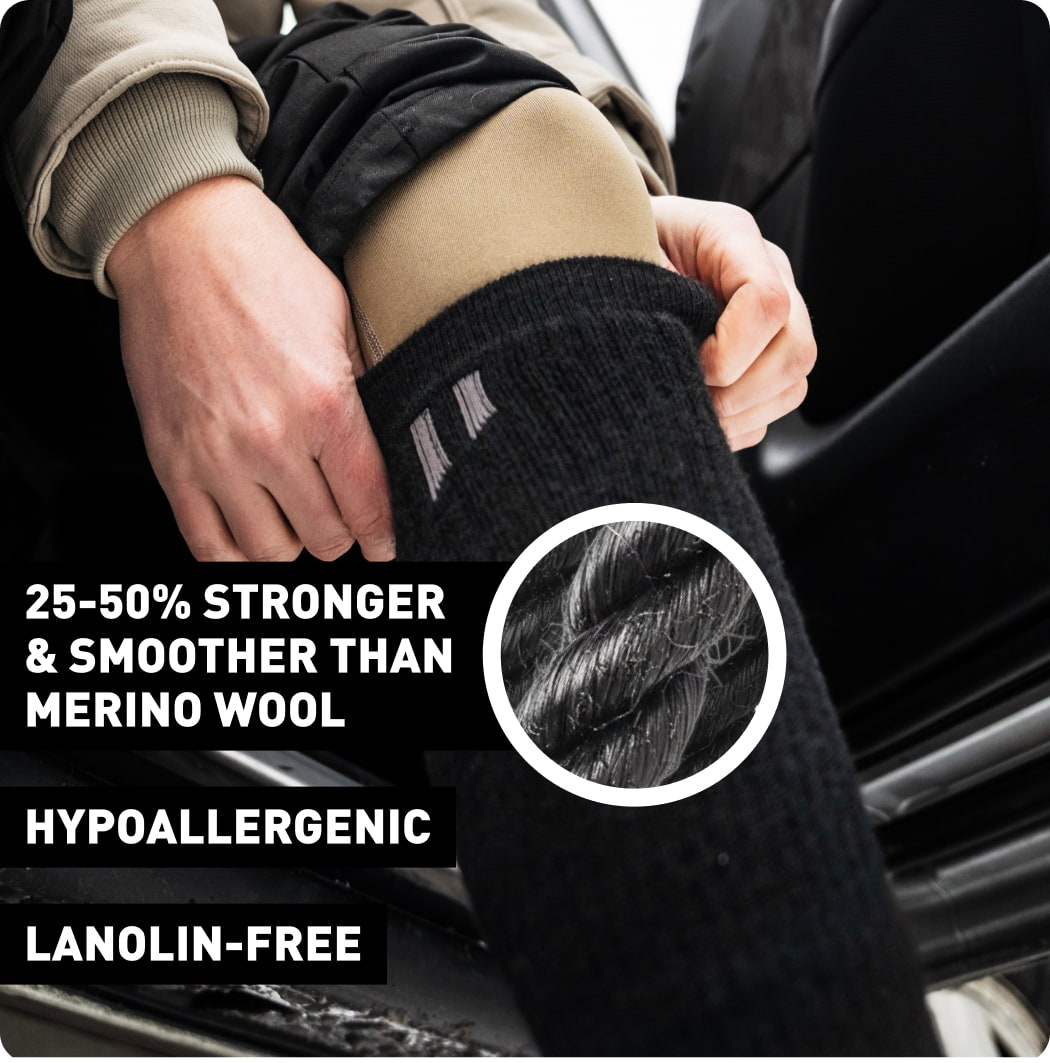 You know how "performance" ski socks feel rough and scratchy? Not these. Baby alpaca fiber is 50% smoother than wool. Hypoallergenic and lanolin-free, no itch, just luxury. 25-50% stronger than merino and reinforced with nylon in heel/toe zones.