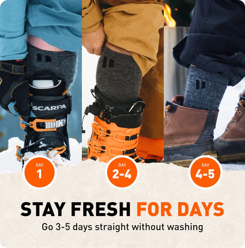 Natural antimicrobial properties inhibit bacteria growth. Wear these for 3-5 straight days of hard skiing without washing—they'll still smell fresh. Perfect for multi-day backcountry trips, hut tours, or powder weeks.