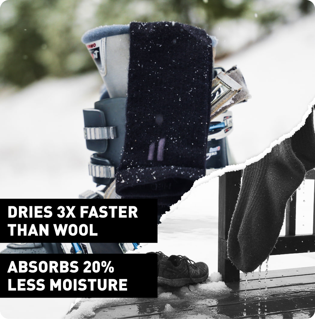 Alpaca absorbs just 10-11% moisture vs. wool's 30%. Pulls sweat away instantly and dries THREE TIMES faster. Even when your boots get soaked from creek crossings or melting snow, these dry out fast so you keep skiing.