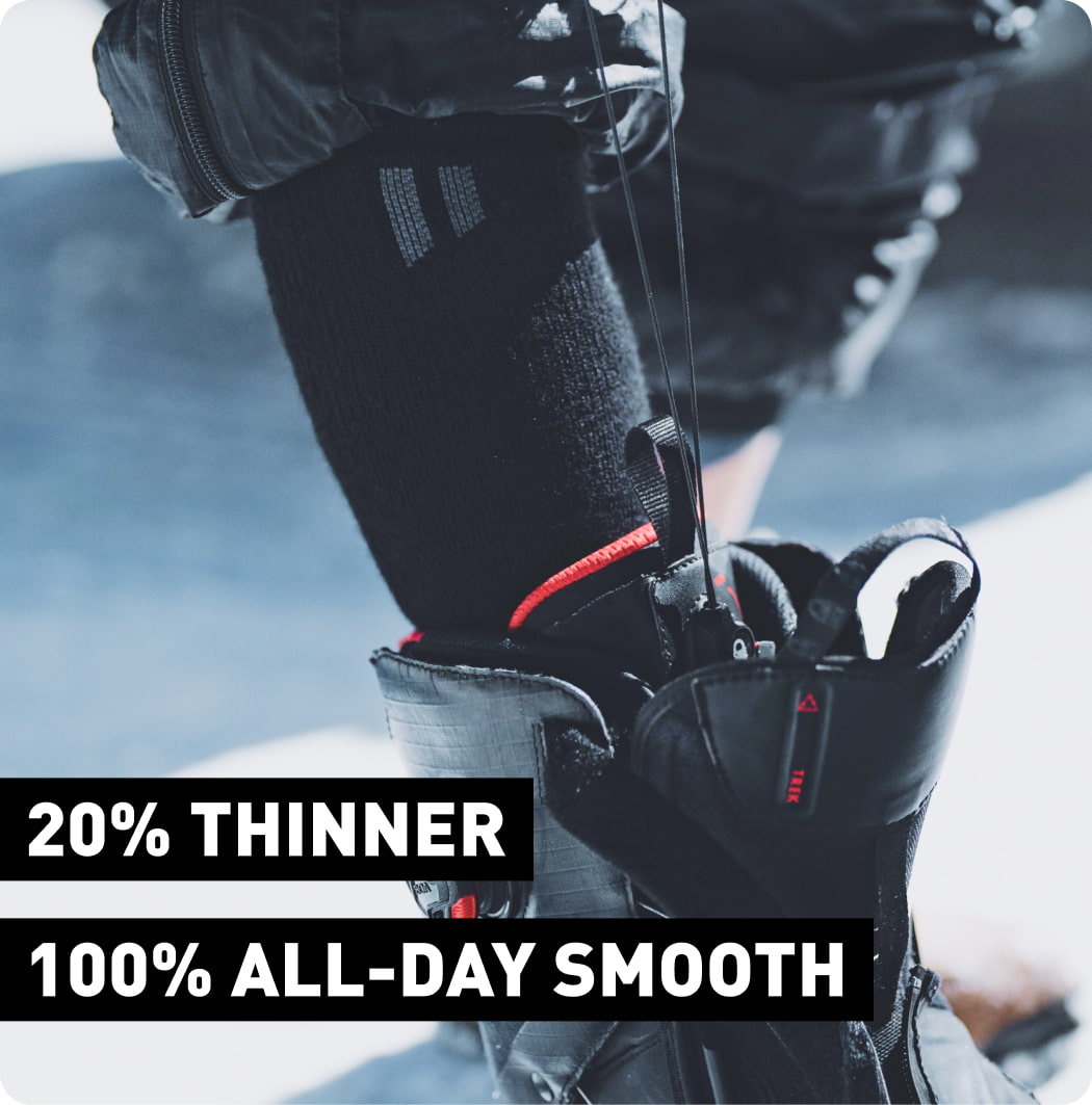Alpaca naturally packs 20% thinner than merino for the same warmth. No bunching at pressure points. No hot spots from excess fabric. Sleek profile fits modern narrow boots without sacrificing warmth or cushioning. While thick wool socks create friction zones that turn into blisters by lunch, these stay smooth all day.