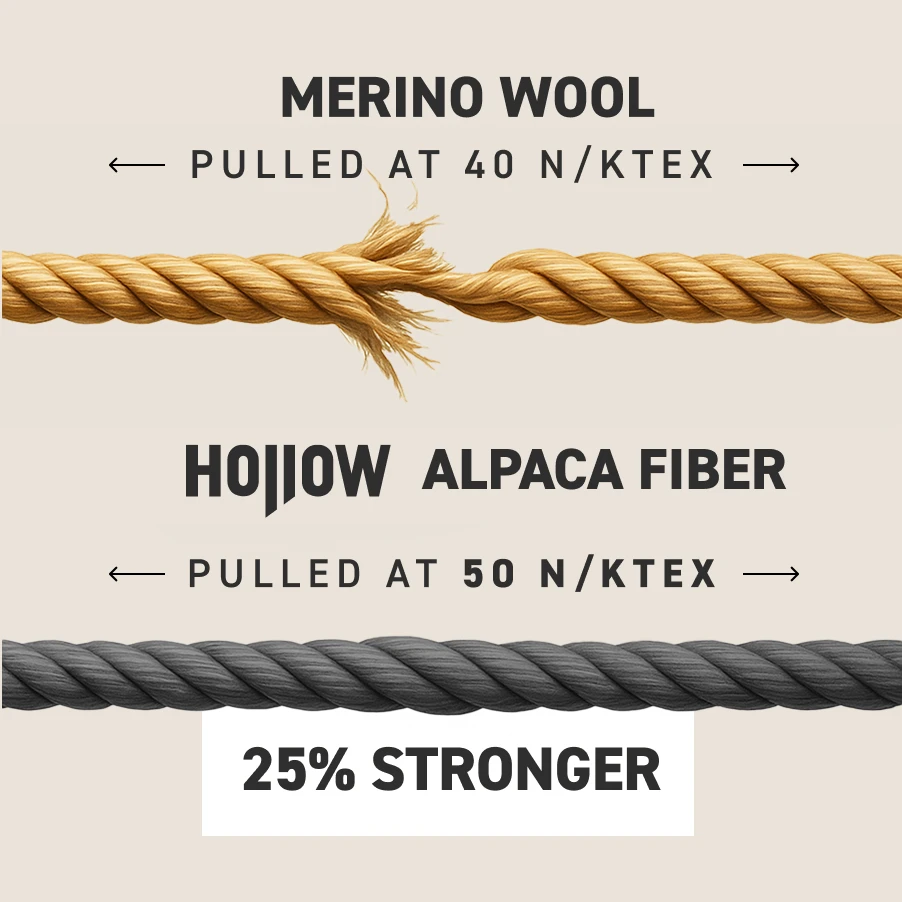 💪 Durability & Strength Hollow Alpaca: 50 N/ktex, 12-18 month lifespan Competitors: 30-40 N/ktex, 3-6 months